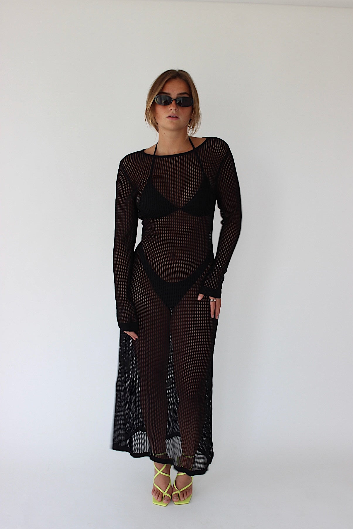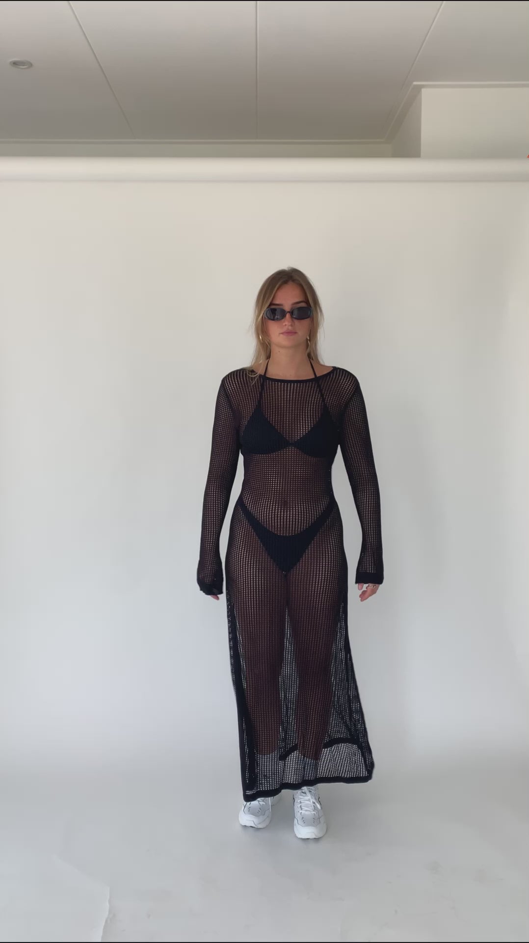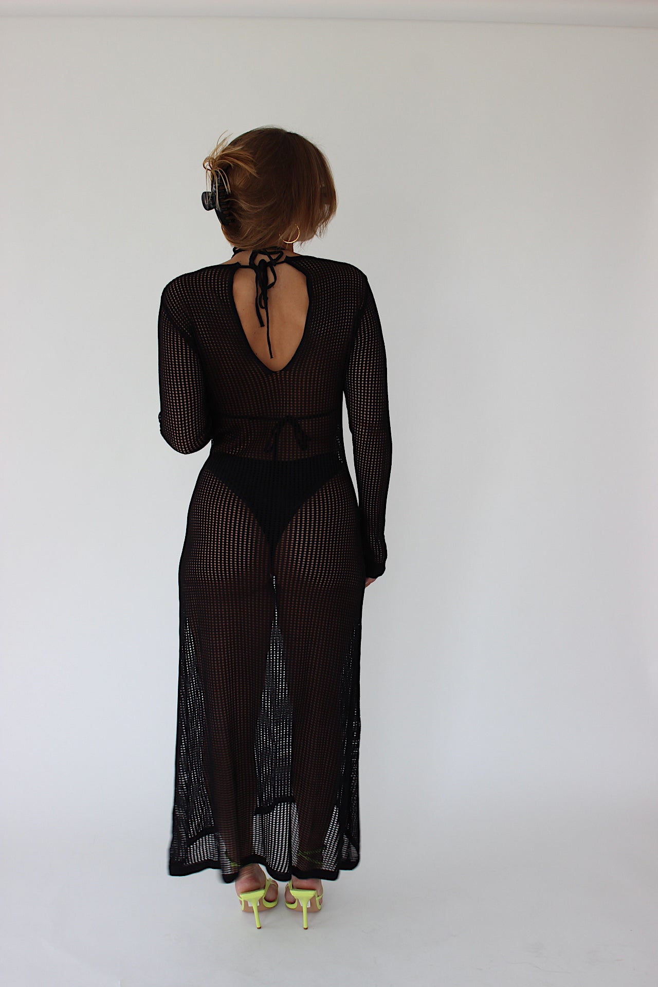 Crochet maxi dress with long sleeves, low back and tie closure which can be worn as cover-up.